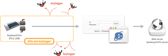The AOS Anti-Keylogger program protects important personal information (password, account number, card number, residence number, etc.) entered through keyboard. This program essentially prevents personal data disclosure attacked by key-logger program or hacking tool.
