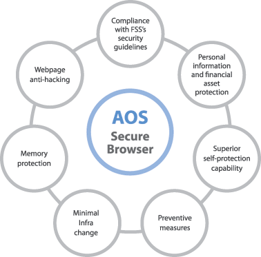 AOS SecureBrowser is a solution for direct detection/blocking of unknown memory hacking tools and provides professional anti-hacking service to protect webpage as well as protecting against memory hacking. AOS secureBrowser provides security service that permits access of only authorized functions/modules instead of taking reactive measures after security threat has been detected.