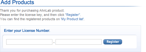 Move to menu `Support > Product Registration`. If you already have an account at global.ahnlab.com, log-in to your